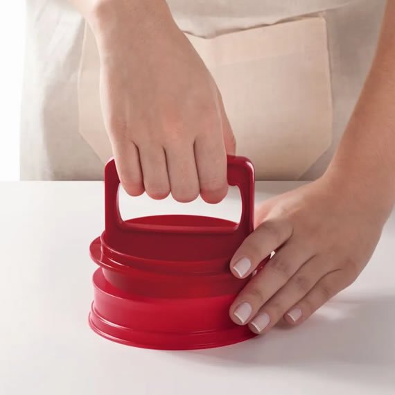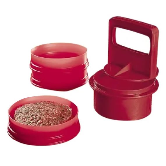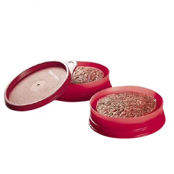 O Burguer Express Vermelho Tupperware é composto por 1 moldador, 1 prensador, 4 bases (empilháveis) e 1 tampa. Além disso é ideal para a preparação de hambúrgueres em casa, ao seu modo!