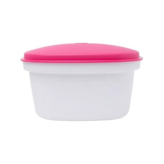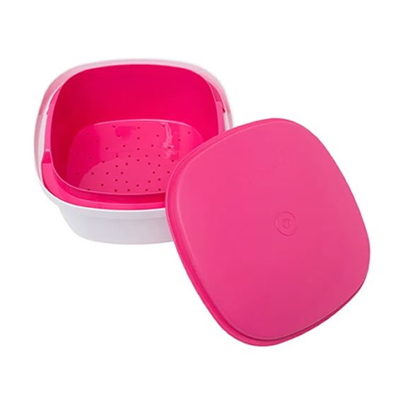 A Múltipla Rosa 2.5L Tupperware possui também tampa rígida e abaulada, além de proteger os alimentos antes de serem servidos ou durante o armazenamento, também faz com que o vapor liberado durante o aquecimento escorra pelas bordas internas até o fundo da peça. Quando o produto for levado ao micro-ondas, basta deixar a tampa na diagonal para ter entrada e saída de ar.