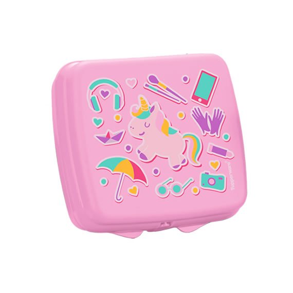 O Porta Sanduíche Stickers é ideal para transportar lanches, sem o risco de amassar ou danificar o alimento. Ele também possui uma trava de segurança, que impede que ele abra dentro da sua mala.
