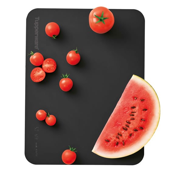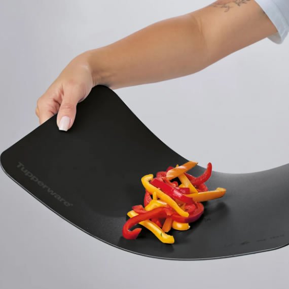 A Tábua Flexível Preta Tupperware é feita com material flexível facilita na hora de despejar o conteúdo cortado. Verso texturizado antiderrapante evita que a tábua escorregue na superfície.