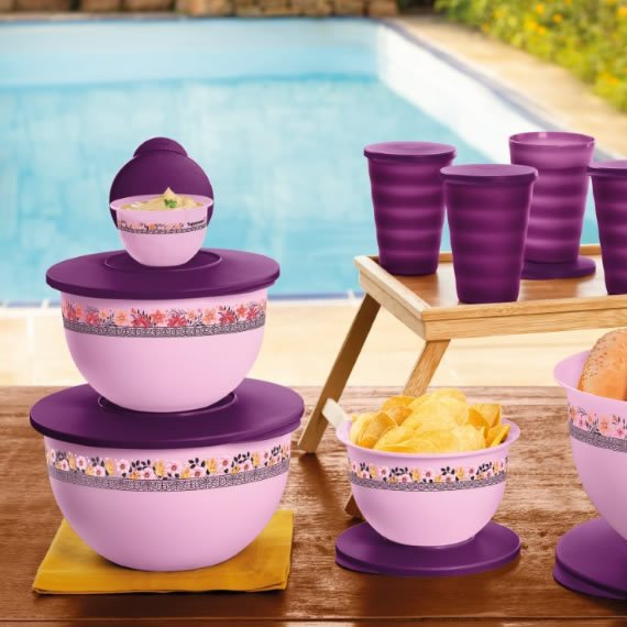 O Tupperware PDA Murano Púrpura 10 Peças foi desenvolvido especialmente para servir diversos tipos de refeições. Com tamanhos variados comportam o que você decidir servir. Além disso sua tampa ajuda a proteger os alimentos caso sobre algo ou você queira preparar antes e servir mais tarde. É composto por: